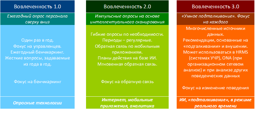 Вовлеченность 2.0 стала важным шагом вперед и сделала обратную связь с сотрудниками более действенной. Сегодня компании регулярно проводят «пульс»-опросы (30% компаний делают это каждый месяц или чаще), и многие организации предоставляют персоналу возможность отправлять свои комментарии о работе в любой момент, когда работники этого захотят. Поставщики услуг на рынке вовлеченности, такие как Glint, CultureAmp, Waggl, Energage, и многие платформы управления талантами теперь имеют встроенные инструменты для использования импульсных опросов, что заставляет принимать решение об их покупке легче, чем когда-либо.